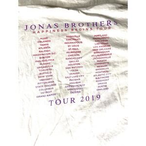 Relive the 2019 Happiness Begins Tour with this officially licensed Jonas Brothers concert tee. Printed on a soft white Gildan Softstyle Ring Spun shirt, it features a bold full-color graphic of the brothers on the front and all tour stops listed on the back.