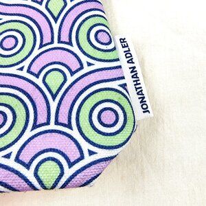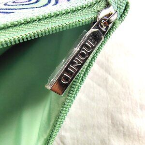 This chic Jonathan Adler Clinique makeup bag is perfect for organizing travel essentials. The stylish mint green and purple design adds a pop of color to your accessories. Its compact size makes it ideal for on-the-go storage.