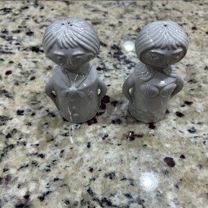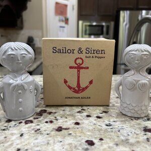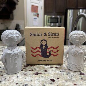Jonathan Adler Sailor & Siren Salt And Pepper Shaker Set With Box. Shakers have never been used and were displayed only. Box shows some shelf wear and has partial store sticker on bottom.