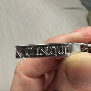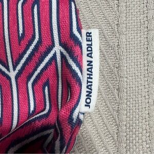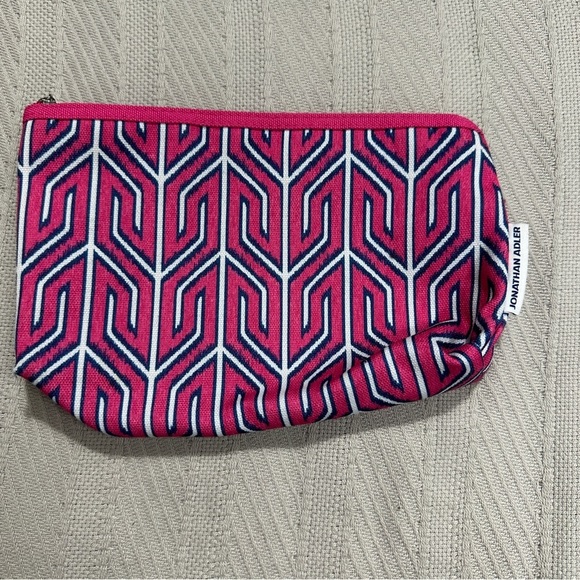Super cute Jonathan Adler for Clinique cosmetic bag. Pink/Navy geometric print, with a pink lining. Great for cosmetics, loose items in your handbag, and more! Measures 9.5" x 6.75".