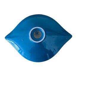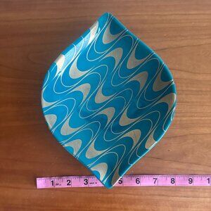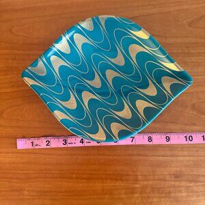 Jonathan Adler trinket dish from the Santorini collection. Teal (some might consider this color to be aqua) and gold. Note that depending on the light, the teal can look light or dark. Approximate measurements are shown in photos 3 and 4. 6th photo with the green circle shows the small white mark. Last photo has been enlarged to show the brand. Well maintained.