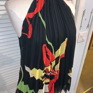 Elegant pleated blouse with vibrant floral design. Features a halter neckline. Perfect for any occasion.