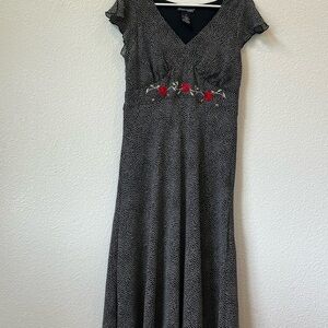 This casual sundress by Jonathan Martin features a striking red and black color palette. The V-neckline and flutter cap sleeves add a feminine touch, while the midi length offers a comfortable fit for relaxed outings.