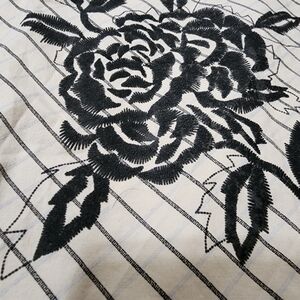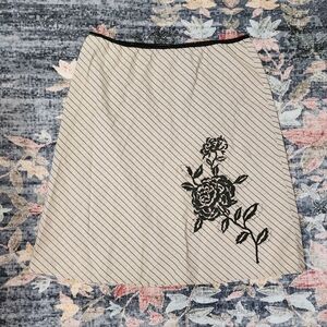 This cream knee-length skirt by Jonathan Martin features a subtle ribbed texture and a black embroidered floral rose design on the lower right side.
