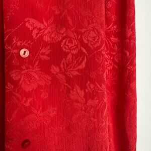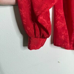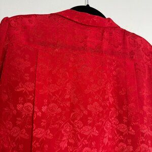 Jonathan Martin red silky button-down blouse. Long button sleeves. Mock collar, the kind that buttons at the left shoulder. Floral jacquard pattern. Pleats down left side. Shoulder pads sewn inside, could be removed easily if you don't like them.
