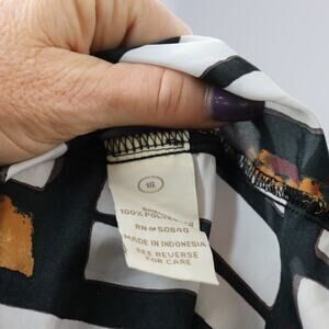 Color/Pattern: Black, white, pink, and gold geometric print with border hem