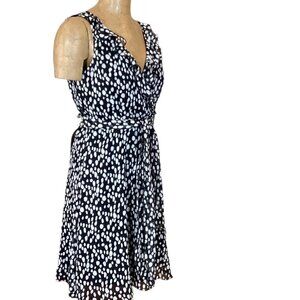 This is a beautiful girlcore/feminine Jonathan Martin dress is a black and white polka dot dress made of chiffon material. It has a V-neckline, sleeveless style, and a side zip closure. The dress features a ruffle faux wrap Surplice V-neck, sash tie, and tie-strap accent across back shoulders. It is a fit and flare, A-line, faux wrap style dress with a size of 8. The dress is perfect for various occasions such as weddings, parties, casual, workwear, and business. It is also lightweight and lined, making it suitable for summer, fall, and spring.