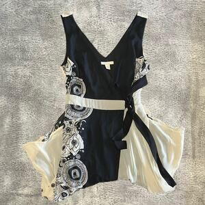-Chic black and cream wrap dress with bold abstract floral print and flirty flowing panels. Universally flattering fit — cinches at the waist with a tie belt. Dress it up with heels or down with boots for a gallery-girl moment.