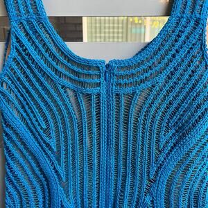 Jonathan SIMKHAI bright blue crochet scalloped hem mini dress. A-line silhouette with a sweetheart neckline. Gorgeous resortwear knit crochet fabrication. Sleeveless. Back zipper closure. Fully lined with nude color lining. In excellent condition. Size 6 - 16.5" pit to pit; 30" waist.