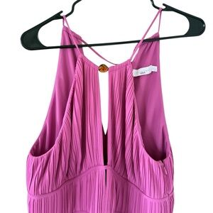 This stunning pink sundress by Jonathan Simkhai features a chic halter neckline and a sophisticated cut-out design. The pleated skirt adds a touch of elegance, making it perfect for a wedding guest or cocktail occasion. Its backless style enhances its allure, ensuring you make a memorable entrance