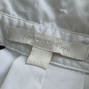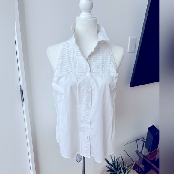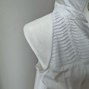 Sleeveless white collar blouse with pleats. A little flowy and the back has a cool peep hole on the spine. Not new and fairly worn but could look bright with a bleach and starch.