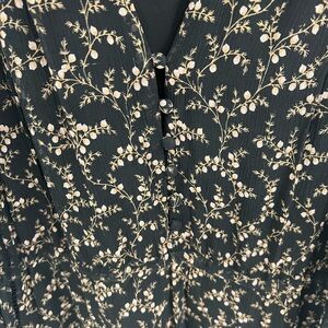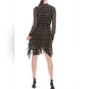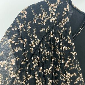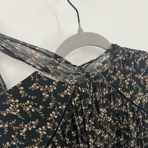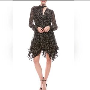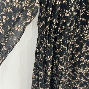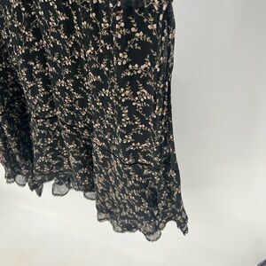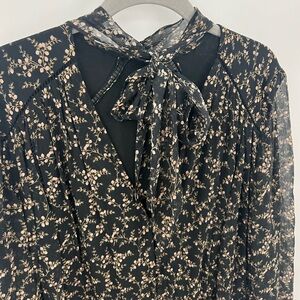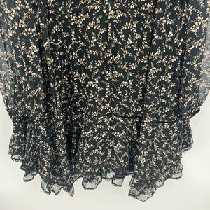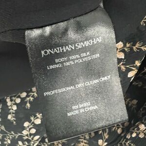 Jonathan Simkhai black tan floral silk flowy dress. Button bodice. Drawstring ties at sides of waist. Neck tie sash.