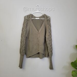 Feminine puff sleeve cardigan with a rich texture and a deep v-neck.