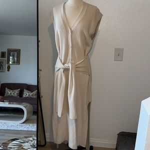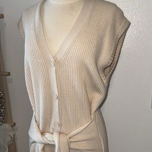 Unlined. Front button closures. Attached waist tie detail. Side slits at hem. Mid-weight rib knit fabric.