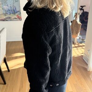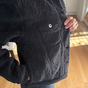 Cozy black teddy jacket with button closure. Soft texture and stylish design. Ideal for layering.