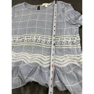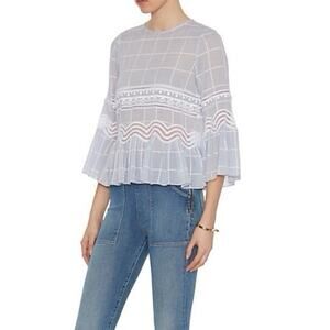 Jonathan Simkhai Blue Voile Grid Cotton Blouse XS Lace Ruffle Hem Top Keyhole