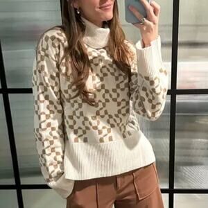 Jonathan Simkhai Brown White Turtleneck Logo Sweater XS Soft Wool Oversized $400