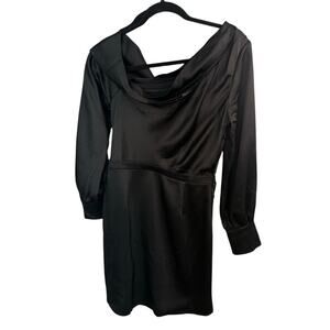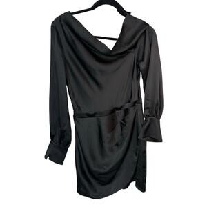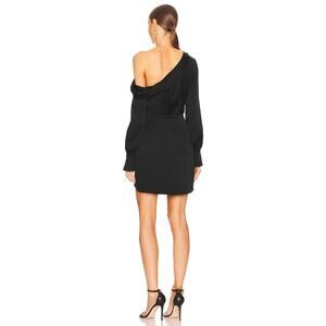 Jonathan Simkhai Cameron Dress in Black. Size 4. Features draped one shoulder, long sleeves with buttoned cuffs, wrap tulip skirt, hidden side zipper closure, satin fabric, and mini length. Style SI-1080-Q. Self: 89% Acetate, 11% Polyethylene. Lining: 100% Polyester. NWD / New With Defects. Has some snags, a tiny hole, and a loose thread.
