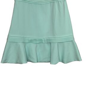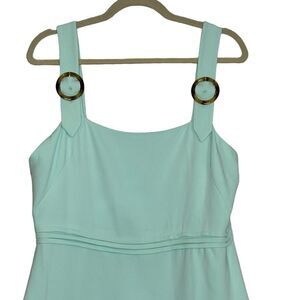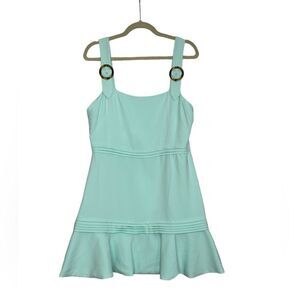 Fitted crepe mini dress defined by tortoiseshell-look belted straps and a playful flounce hem.
