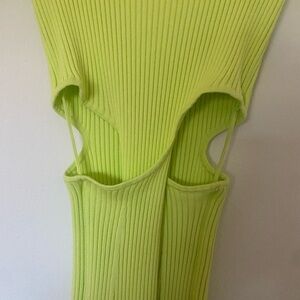 Jonathan Simkhai's Collette midi dress features cutout and twisted details at the waist. Shaped into a fitted silhouette, the ribbed-knit design has a scoop neckline and is in the color lemongrass. The dress is made of a 83% viscose, 17% polyester blend and is in great preowned condition with no visible wear. Originally retails for $475.