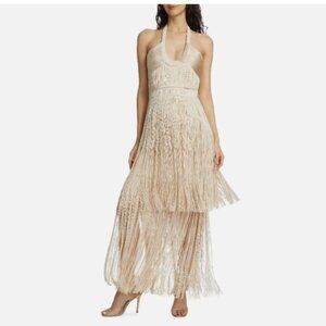 Elegant cream maxi dress with fringe details. Halter neckline. Perfect for special occasions.