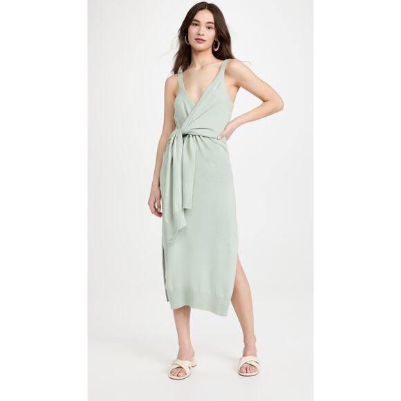 Jonathan Simkhai Ezra Midi Dress in Lichen. Size M / Medium. Features V-neck, sleeveless, tie front, side slits, ribbed hem, wrap silhouette, and midi length. Style 222-1002-K. 90% Cotton, 10% Cashmere. NWT / New with tags.