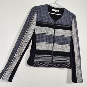 On offer is this wonderful Jonathan Simkhai jacket. Size small. Consists of polyester, spandex, and nylon. This jacket features abstract / tribal fabric prints in various textures, including lace and mesh details, sewn together in horizontal bands. Colors include black, white, gray, indigo blue, navy blue, silver, gold. Collarless. Exposed zip front closure. Long sleeves with zippered cuff details. Stretchy black side panels on jacket and sleeves. Lightly fitted silhouette. In excellent preowned condition.