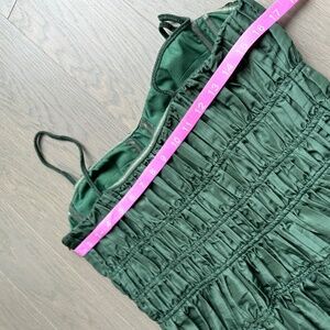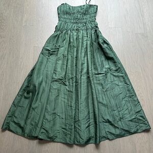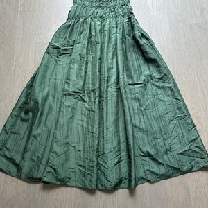 Elegant green maxi dress. Features a ruched bodice. Flowy skirt with pockets. Perfect for any occasion.