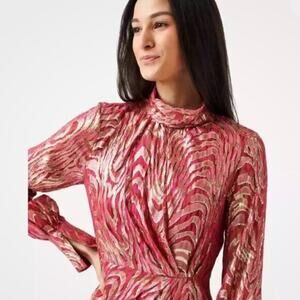 The Halen Fil Coupe Mini Dress in Bougainvillea Metallic Moire. Showcasing energizing femininity, this stunning mini dress is constructed from a silk blend fil coupé overlayed with a glittering metallic jacquard brocade. Mockneck collar with cuffed long sleeves and fitted wrap waist.