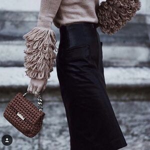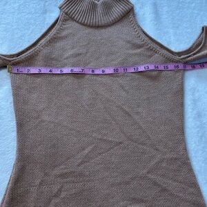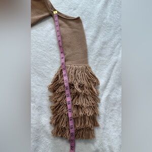 This Jonathan Simkhai sweater in a warm tan shade showcases a stylish turtleneck and eye-catching fringe details at the cuffs. The cold-shoulder design and ribbed knit texture enhance its modern appeal, making it a standout piece for any occasion.