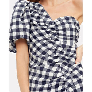 Jonathan Simkhai Lux Twill One-Shoulder Gingham Dress in Navy. Size 8. Features one shoulder neckline, short puff sleeve with elasticized cuff, ruched detailing, hidden side zip closure, high-low flounce hem with side slit, gingham print, and midi length. Shell: 100% Viscose. Lining: 100% Polyester. Excellent pre-owned condition, no flaws.