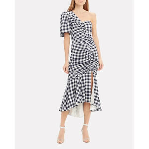 Jonathan Simkhai Lux Twill One-Shoulder Gingham Dress in Navy. Size 8. Features one shoulder neckline, short puff sleeve with elasticized cuff, ruched detailing, hidden side zip closure, high-low flounce hem with side slit, gingham print, and midi length. Shell: 100% Viscose. Lining: 100% Polyester. Excellent pre-owned condition, no flaws.