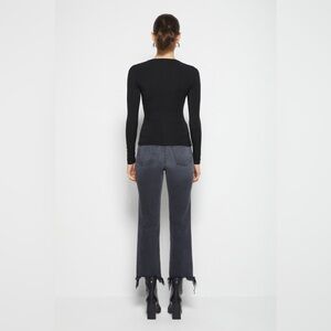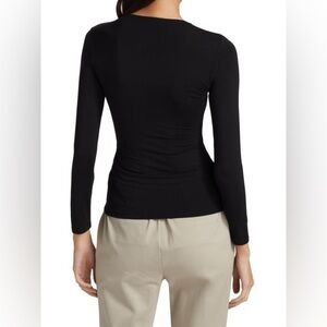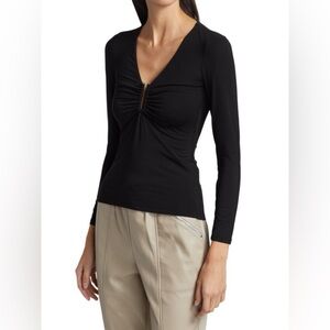 The Madeline Hardware Top in Black. Figure hugging compact matte jersey in a long sleeve top with deep V neckline decorated with U-shaped hardware accent.