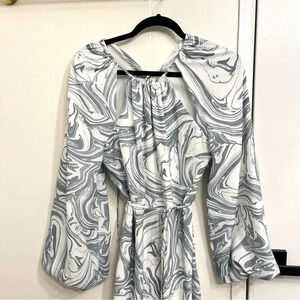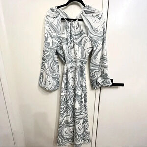 Jonathan Simkhai Mellia marble print midi dress. White and gray blue. Open back, tie waist. New with tags- one very very faint spot circled in pics, it’s on the back where it ties. Size medium.
