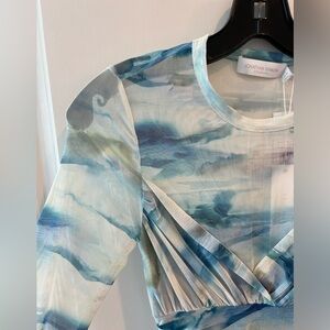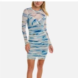 Nica Ruched Watercolor Mesh Cutout Mini Dress