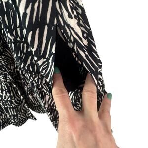 • Features: NO BELT; MISSING. Asymmetric Neckline, Allover Abstract Print, One Sleeve,Short Puff Sleeve With Elasticized Cuff, Black/White, Side Zip Closure, Tiered At Skirt, Shell: 86% rayon/20% nylon; lining: 100% cotton.