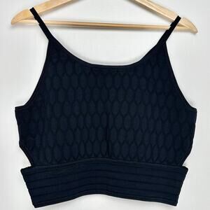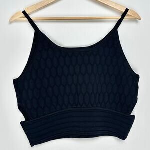 Really great quality crop top from Jonathan Simkhai. Quilted jacquard top with spaghetti straps and small cutouts on the sides for added interest. Super stretchy and comfortable. Bottom of top is a wide band to emphasize your tiny waist and hold you in place.