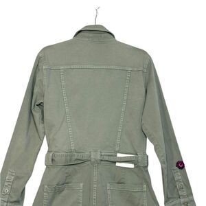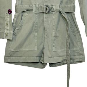Long sleeve canvas olive green utility romper. Flawless condition! Check out the sweet little floral embroidery detail.