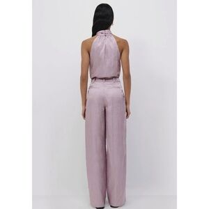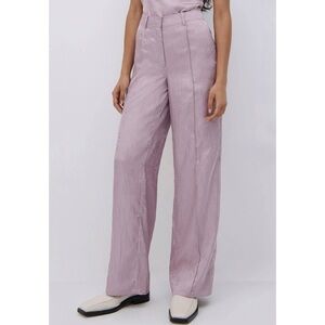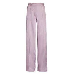 The Fleur Satin Wide Leg Pant in Dusty Rose. Tailored from a crinkle satin twill for subtle texture and dimension. A banded high waist falls into a seamed wide leg.