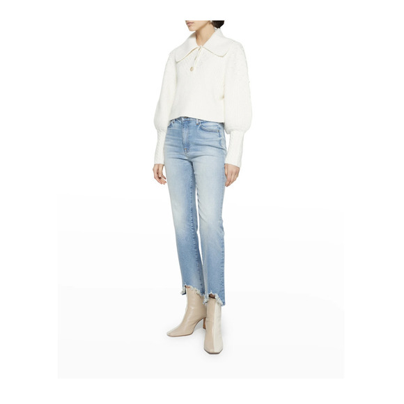 Jonathan Simkhai Standard "River" medium-wash denim jeans with frayed high-low hem Approx. measurements: 14.5" rise; 28" inseam High rise Five-pocket style Slim, straight legs with distressed details. Cropped above ankles Button/zip fly; belt loops Organic cotton/elastane Imported