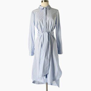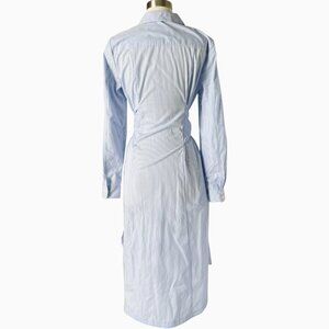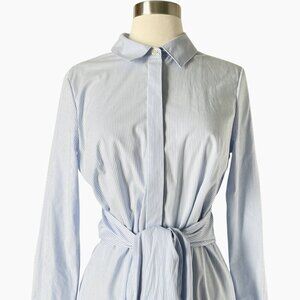 Elevated and timeless, this Jonathan Simkhai striped shirt dress blends classic shirting with contemporary tailoring. Featuring light blue and white pinstripes, a self-tie belted waist, concealed button placket, and long sleeves, it offers both structure and ease. The versatile midi length and tailored finish make it perfect for workwear, dinners, or elevated everyday styling.