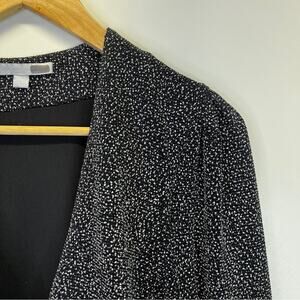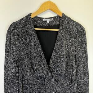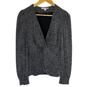 Jonathan Simkhai Twist Front Glitter Top in black. Crafted from glittering mesh. . The deep V-neckline is accentuated by a flattering twist front detail. Features long sleeves. Fully lined for comfort, this statement piece effortlessly combines elegance with a hint of edge.