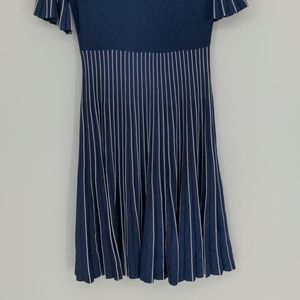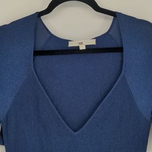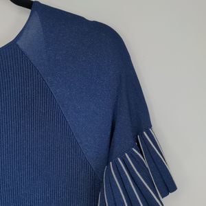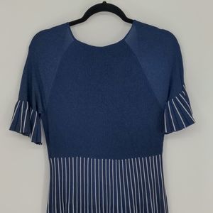 Blue and white striped knit (95% Viscose, 5% Polyester). Hourglass. Short sleeves. V-neckline.