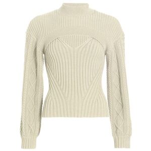 Mixed knit design, featuring fisherman and rib-knit details. Cut with a mock turtleneck, this style features balloon sleeves and a chest cut-out.