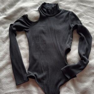 Jonathan Simkhai mock neck Black Ribbed Turtleneck Bodysuit with cut out on 1 side & 1 shoulder. Has some stretch. Size XS. Good condition, no stains or damage, some wear throughout. No trades