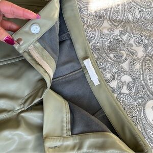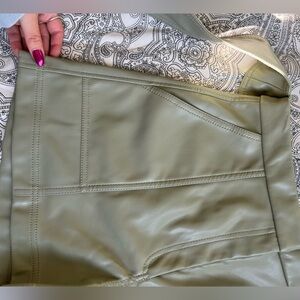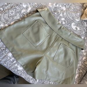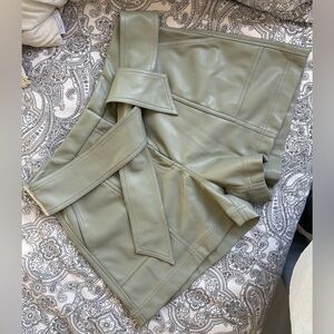 Vegan leather belted shorts in a pale sage color from Jonathan simkhai. Buttery soft leather material with felt lining. Machine washable, self-tie belt makes the waist adjustable.