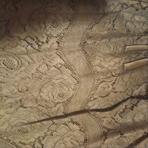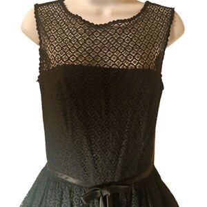 Gorgeous vintage lace fit and flare special occasion dress has lace bodice, keyhole back , back zipper closure, fitted waist with thin satin bow, full pleated floral lace circle skirt , black tafetta lining adds fullness, union made. No size tags measurements: 30" bust 25" waist 41" long falls below the knee size S retro sexy glamorous prom party