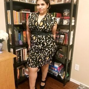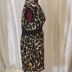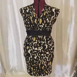 Cheetah print dress, sleeveless, v-neckline, black rouched front waistband and elastic back waistband. Show of your curves on this sexy dress or add a fun colored blazer for a more professional look.