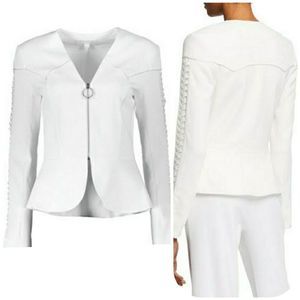 Lace-up details are key in Jonathan Simkhai's and this jacket has them delicately woven down the sleeves. Tailored from crepe, it has a slim fit that's emphasized by satin seams and a subtle peplum hem.