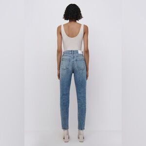 The Trevor Tapered Denim in Pacific City Wash. High rise with a tapered straight leg, and a relaxed boyfriend inspired fit. Minor vintage distressing and whiskering throughout.